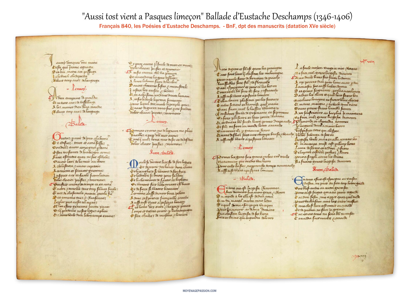 En terme de sources médiévales, l’œuvre d’Eustache Deschamps est principalement concentrée dans le ms Français 840 de la BnF. Ce manuscrit daté des débuts du XVe siècle est un incontournable pour qui s’intéresse aux productions poétiques du champenois.
