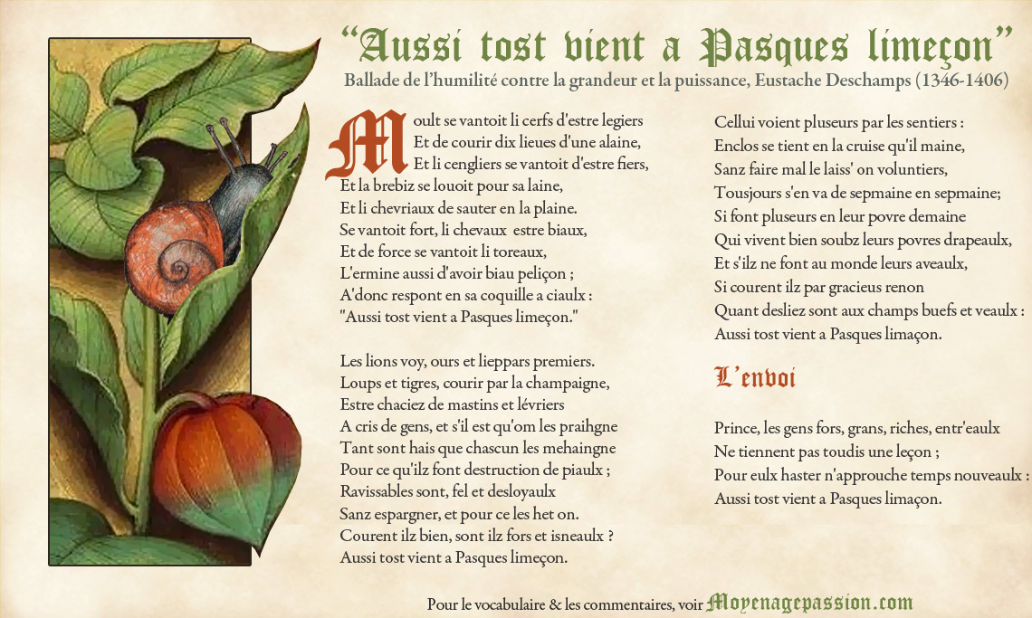 « Aussi tost vient a Pasques limeçon. » scandera le refrain de la ballade. Si le modeste « limaçon » ne possède pas les qualités dont se targuent les autres animaux du bestiaire, « il arrive à temps pour Pâques » et parvient à destination.