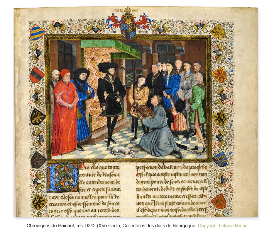 Notes : l’enluminure ci-contre est sans doute une des plus célèbres de la collection. Tirée des Chroniques de Hainaut ( ms 9242), elle met en scène le puissant duc de Bourgogne Philippe le Bon, vêtu de noir au centre de l’illustration. Face à lui, Simon Nockart, fonctionnaire du Hainaut, présente son hommage et l’ouvrage des Chroniques. Derrière le duc et à ses côtés, un certain nombre de nobles, de conseillers et d’hommes de pouvoir de l’époque sont tous là pour marquer leur allégeance, autant que l’importance de ce moment. Si vous êtes amateur d’histoire médiévale et de ce type d’enluminures, la bibliothèque numérique du musée bruxellois vous en réserve désormais une pléthore.