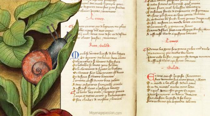 Sur notre illustration, ainsi que l’image d’en-tête, l’enluminure de l’escargot sur son lit de verdure est un montage réalisé par votre serviteur à partir de diverses sources.