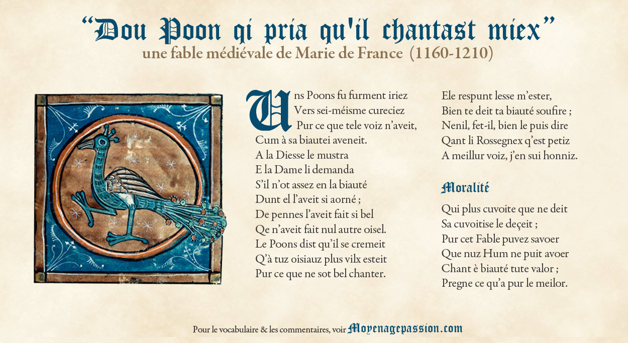 Dans la fable du jour, la poétesse nous invite à suivre un paon mécontent de son sort et surtout de son chant. A l’habitude, nous remonterons aux origines historiques de ce récit. Nous vous en proposerons également un commentaire et une traduction en français actuel. Avant cela, disons un mot du paon et de quelques symboles qui lui sont attachés dans les bestiaires médiévaux.