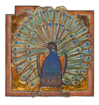 Enluminure d'un paon faisant la roue dans le Bodley Bestiary, manuscrit MS Bodley 764 daté du XIIIe et conservé à la la Bibliothèque Bodléienne d'Orford (Bodleian Library).