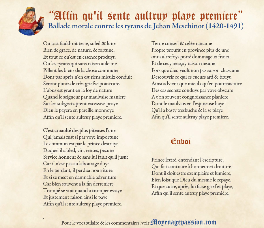 Sujet : poésie morale, poésie médiévale, poète breton, ballade médiévale, ballade satirique, auteur médiéval, Bretagne médiévale, tyran, grands rhétoriqueurs.