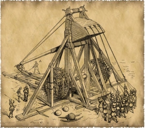 Dans cette famille des engins de siège « mastodontes », il y aura encore le mangonneau qui, par un système complexe de contrepoids, compensera certaines limites du trébuchet. Mais il reste que ces deux engins supposent tout de même de mobiliser un nombre conséquent d’hommes pour les manipuler, les connaissances suffisantes pour les fabriquer ou les monter, et faut de mieux, les deniers pour les acquérir. Il n’est donc à pas à la portée d’un quelconque vassal.