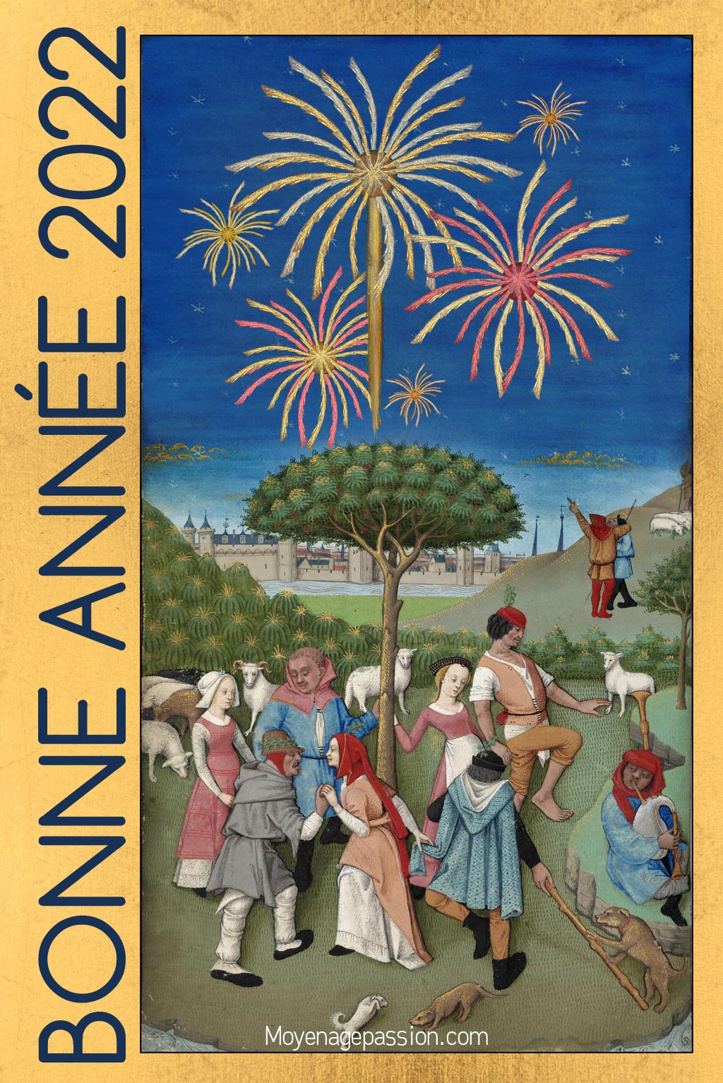 Originellement, cette enluminure avec sa danse médiévale et ses deux personnages pointant le ciel, à l’arrière plan, fait référence à la célèbre scène biblique de l’Annonce faite aux bergers. Elle en suit, toutefois, assez peu le formalisme avec son choix original de mettre en avant une célébration plutôt champêtre pour fêter l’arrivée du Christ.