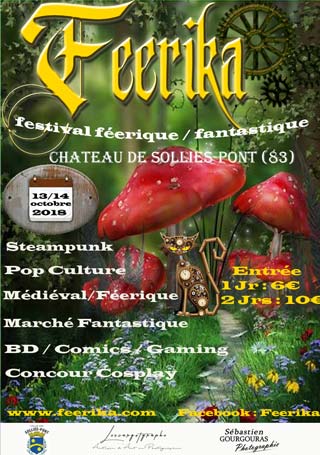 ous en avions fait mention dans nos agendas précédents et le voilà déjà de retour dans l’actualité. Feerika, le jeune Festival qui célèbre tout à la fois, le médiéval fantastique, les joies du Cosplay, le steampunk et la pop culture, et finalement à travers tout cela un peu de la Geek culture trouve, semble-t-il, avec bonheur son public. Cette fois-ci, faisant suite à sa dernière édition de mai 2018, il essaimera un peu plus loin que l’Isle-sur-la-Sorgue, pour continuer sa balade itinérante dans sa région de prédilection, le sud de la France. Cette fin de semaine, c’est donc au château de Solliès-Pont qu’on pourra le retrouver.