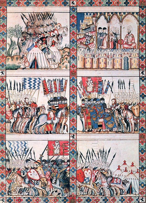 NB : la miniature médiévale ayant servi à l’image d’en-tête est également tirée du Codex Rico, Ms TI1. Ce manuscrit médiéval daté du courant du XIIIe siècle est conservé à la bibliothèque de l’Escurial de Madrid. On y voit clairement les forces en présence et la bannière de la Sainte évoquées dans la cantiga.