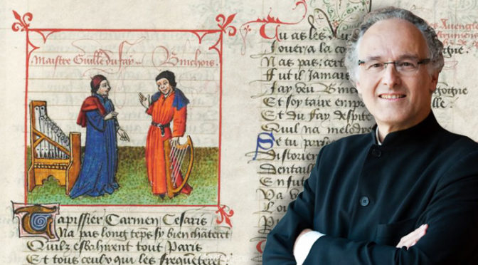 Le nom de Gilles Binchois demeure indissociable de celui de Guillaume Dufay dont il est contemporain. Les deux hommes se sont même connus et côtoyés à la cour de Bourgogne. Martin Franc, religieux et poète de ce même XVe siècle en a témoigné dans son ouvrage de 1440 : Le Champion des Dames. Il en est d’ailleurs ressorti une enluminure célèbre que nous ne nous privons pas d’utiliser en tête de cet article ( aux côtés de Dominique Vellard de l’ensemble Gilles Binchois). Elle est tirée du superbe manuscrit médiéval Français 12476 de la BnF ( consultable ici). Aux dires de Martin Franc, Dufay et Binchois ont été clairement influencés par le compositeur anglais John Dunstable (1390-1453) même s’ils ont su enrichir leurs inspirations de leur propre style et talent.