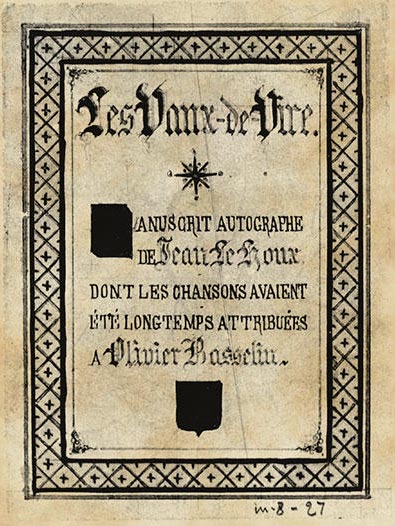 ans le courant du XVe siècle, en Normandie et plus précisément dans le Calvados, aurait vécu, en la cité de Vire, un poète du nom d’Olivier Basselin. Peu soucieux de chanter l’amour, l’homme aurait laissé, derrière lui, un legs fait d’odes à Bacchus et de chansons à boire, au point même d’avoir donné naissance et des lettres de noblesse à un genre local : le Vaux de Vire ou Vaudevire. Bien sûr, la Normandie ne l’avait pas attendu pour entonner ses