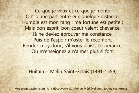 Au programme du jour donc, trois poésies courtes et trois dizains courtois, issus des œuvres poétiques de Melin de Saint-Gelais. Le moyen français n’y pose guère de difficultés. Nous vous les livrons donc à l’état brut.